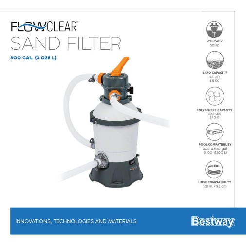 A Bestway homokszűrős vízforgatói segítenek a medence karbantartásában, hogy azokat hosszú ideig használhassuk. A Bestway vízforgatói könnyű és kényelmes megoldást kínálnak a medencevíz tisztán tartására. Használatukkal távol tarthatjuk a medencéből a koszt, homokot és egyéb szennyeződéseket. A papírszűrős vízforgatókkal ellentétben a homokszűrős vízforgató karbantartása egyszerűbb, a homokot elegendő 2-3 évente lecserélni.