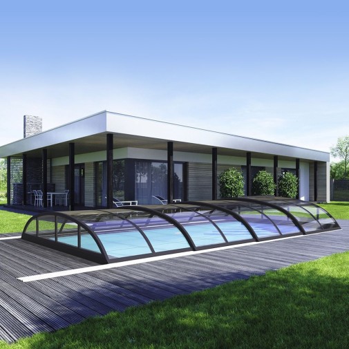 A Klasik medencefedés professzionális változata, amely 413x850 cm-es méretben készült, de csak 100 cm-es külső magassággal. Szuperelegáns, minimalista fedés. Víztiszta vagy opál polikarbonát ablakokkal, antracit színű szerkezettel. AIR kétoldalas sínpályával, rögzített hátsó homlokzattal.